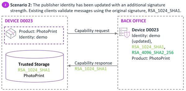 In scenario 2, the publisher identity in the back office has an additional signature strength. Existing devices running the client software that was built using the original, unchanged identity use the original signature strength to validate downstream messages.