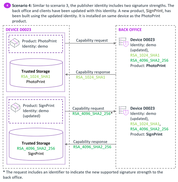 In scenario 4, the publisher has launched another new product which has also been built using the updated identity. It is installed on the same device as the PhotoPrint product. However, both clients use their own trusted storage. PhotoPrint will use the original signature strength, while SignPrint will use the higher signature strength to validate downstream messages.