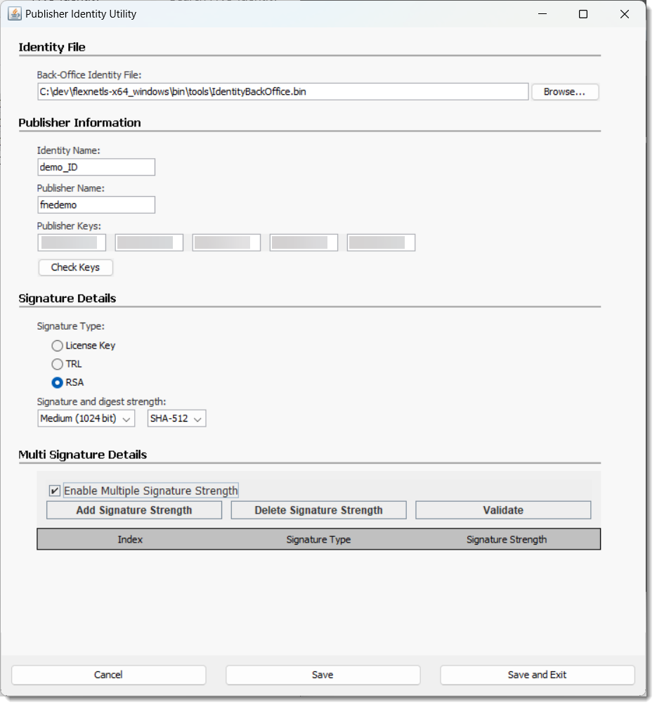 | • | To add or delete a signature strength, publishers specify the existing back-office identity that they want to modify in the Identity File section. Clicking Enable Multiple Signature Strengths displays controls for adding, deleting or validating a signature strength. Again, clicking Save or Save and Exit prompts the publisher to specify a folder. This folder will hold a subfolder with a file name in the format YYYY-MM-DDThh-mm-ss-sss which will contain the updated set of identity files. |