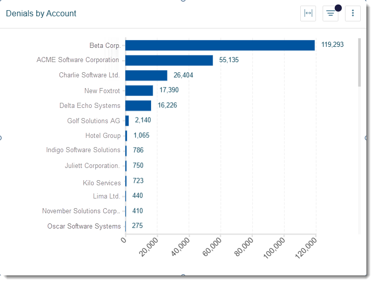 The Denials by Account bar chart shows the denials segmented by account, offering valuable insights into the key accounts that should be prioritized for revenue generation opportunities.