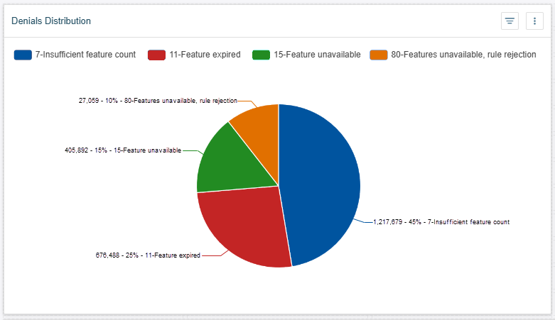 | • | Denial reasons—Reasons are grouped by the denial status code, along with the percentage distribution per denial code. Identifying the most common reasons for denials—such as, for example, insufficient feature counts or elastic tokens, expired features, features not available due to rule rejection—allows producers and their customer to take corrective action. |