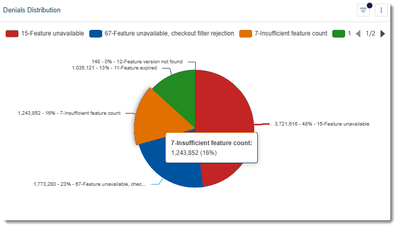 The License Server Usage report (under Analytics > License Server Usage) has been expanded to include a new chart, called Denials Distribution, covering denials data. To reflect this new capability, the License Server Usage report has been renamed to License Server Usage and Denials.