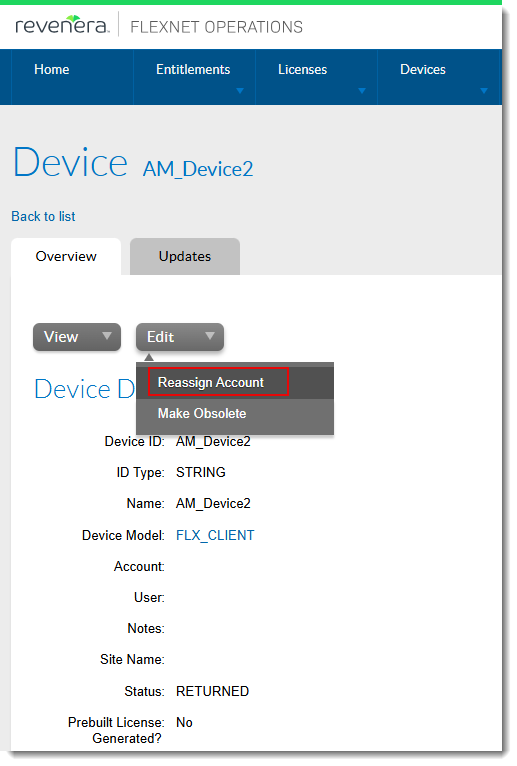 Producers can reassign a returned device to an account using the menu item Reassign Account from the Edit menu on the Device page. (To access the Device page for a returned device, click Devices > Devices > click a hyperlinked device name.)