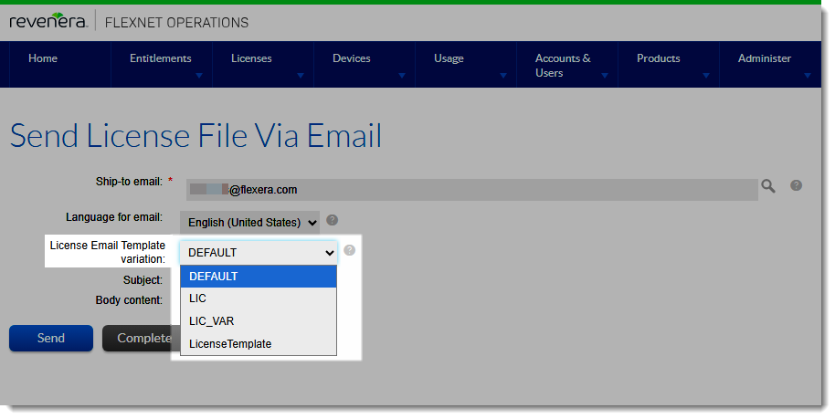 For FlexNet Publisher licenses, producers can select the License Email template from the License Email Template variation dropdown menu on the Send License File Via Email page.