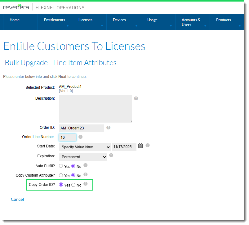The new Copy Order ID? option on the Entitle Customer To Licenses | Bulk Upgrade - Line Item Attributes page.