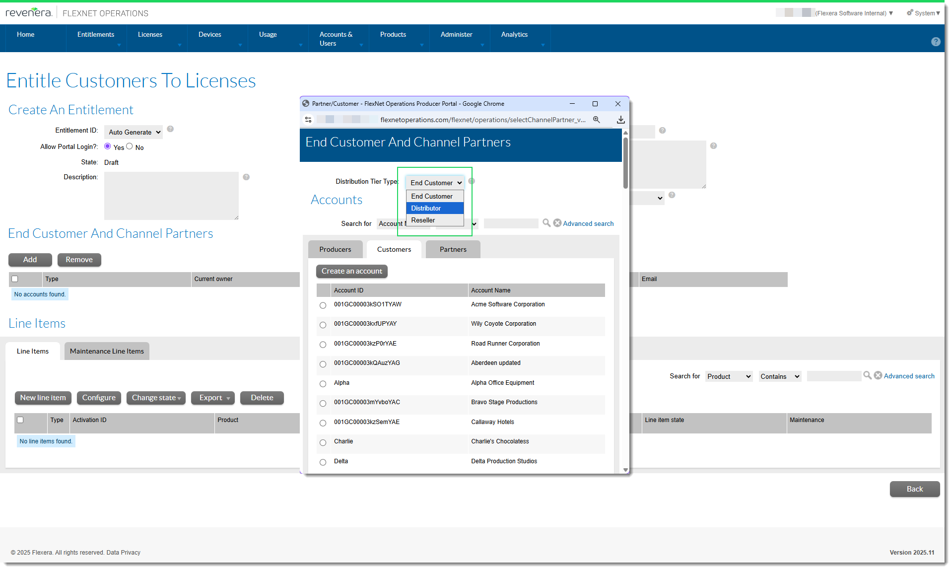 Once configured, the Distribution Tier Type dropdown menu in the End Customer And Channel Partners dialog (displayed when adding line items to an entitlement) is automatically populated with the pre-set value.