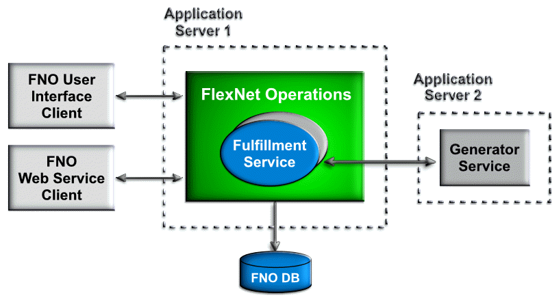 The server that implements this WSDL is hosted separately from the one that runs FlexNet Operations. It hosts the service externally and operates independently of FlexNet Operations, as shown in the figure below. The external service is accessed by FlexNet Operations at run time for operations such as product and license model validation and license generation.
