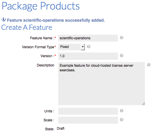 In the Producer Portal, use the commands under the Products menu to add a feature called scientific-operations, version 1.0. and a feature called baseline-client-reg, version 1.0. When defining the features, use the following settings: