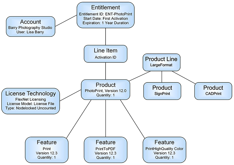 An entitlement represents a product, with its associated license model(s), that a customer has purchased. The following figure depicts the relationships that you set up in the exercises of this getting started section.