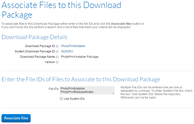The Associate Files to this Download Package page with file IDs for the PhotoPrint Installer Package.