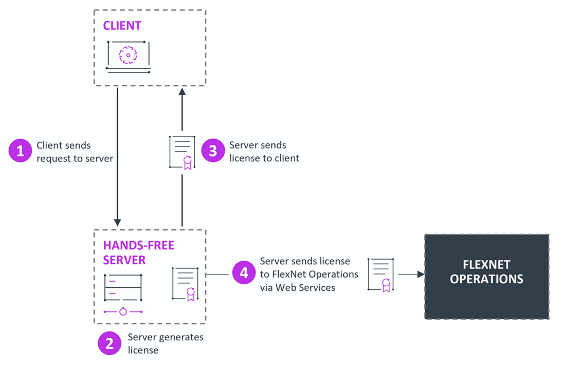 Licenses that use hands-free technology are generated programmatically between a client and the FlexNet Operations server using a third-party system. A license request, usually in XML format, is submitted to the license server, which processes the request and sends a response to the client. The server generates the license and stores the license information in FlexNet Operations, where it is tracked.