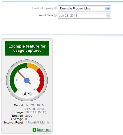 This type of graph shows usage data as a graphical gauge representing the percentage of usage compared to the overall entitled amount. The green region of the gauge indicates usage of none to 75 percent of the available count; the yellow region indicates 75 percent to 100 percent of the available count; and the red region indicates over 100 percent (overage) of the entitled amount.