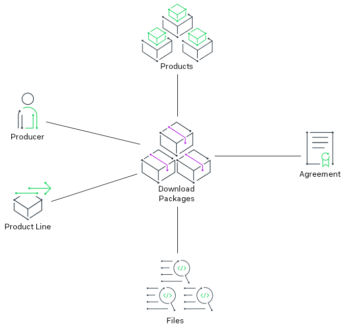Downloads are specified as download packages. A download package describes a group of files and relates that group with a product, a producer, and, optionally, a license agreement.