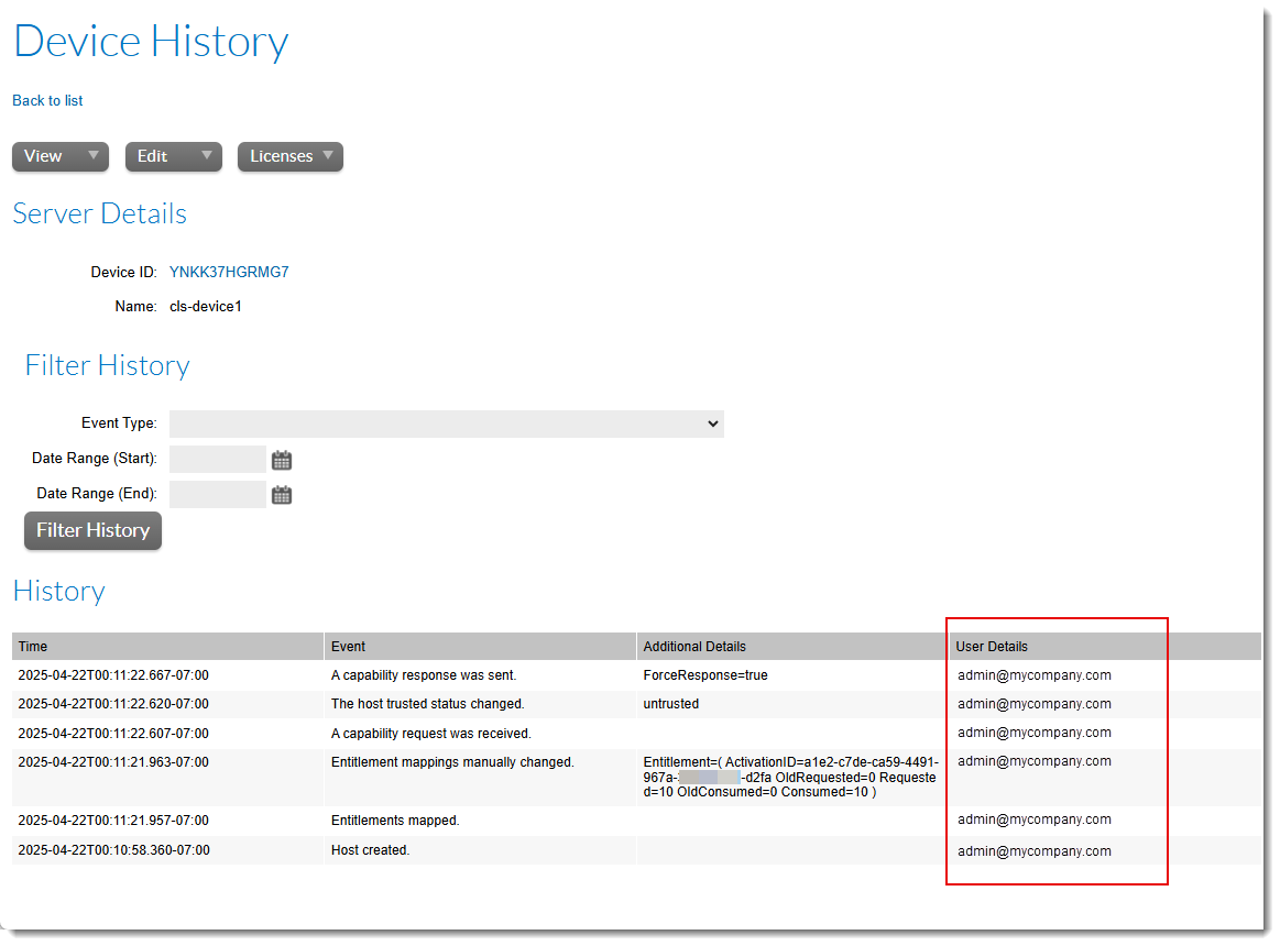 The Device History page (available by clicking View > View Device History on a Device or View Server page) now includes a User Details column, which lists the name of the user who triggered an event (for example, creating a device or mapping entitlements).