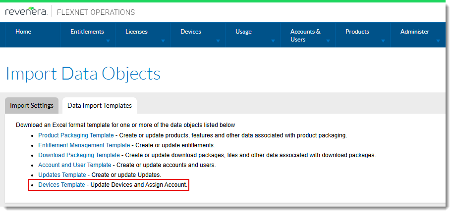 To download the Devices Template (XLSX format), click Administer > Import Data Objects and select the Data Import Templates tab.
