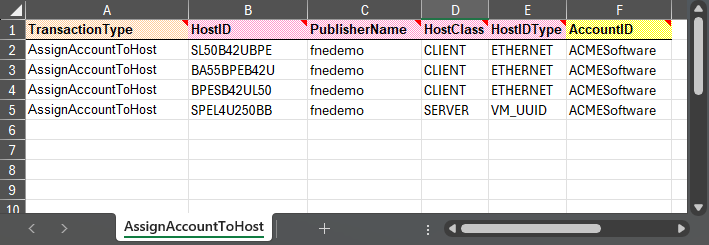 In the template, the following properties must be provided to update account information for devices: host id, publisher name, host class, host id type and account ID.