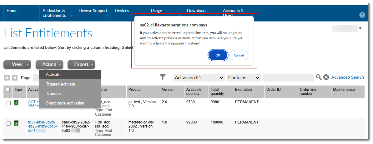 | • | When the configuration option is selected, and a user tries to activate an upgrade line item that is linked to the parent line item (by navigating to the List Entitlements page, selecting an entitlement and clicking Activate), the following warning is displayed: |