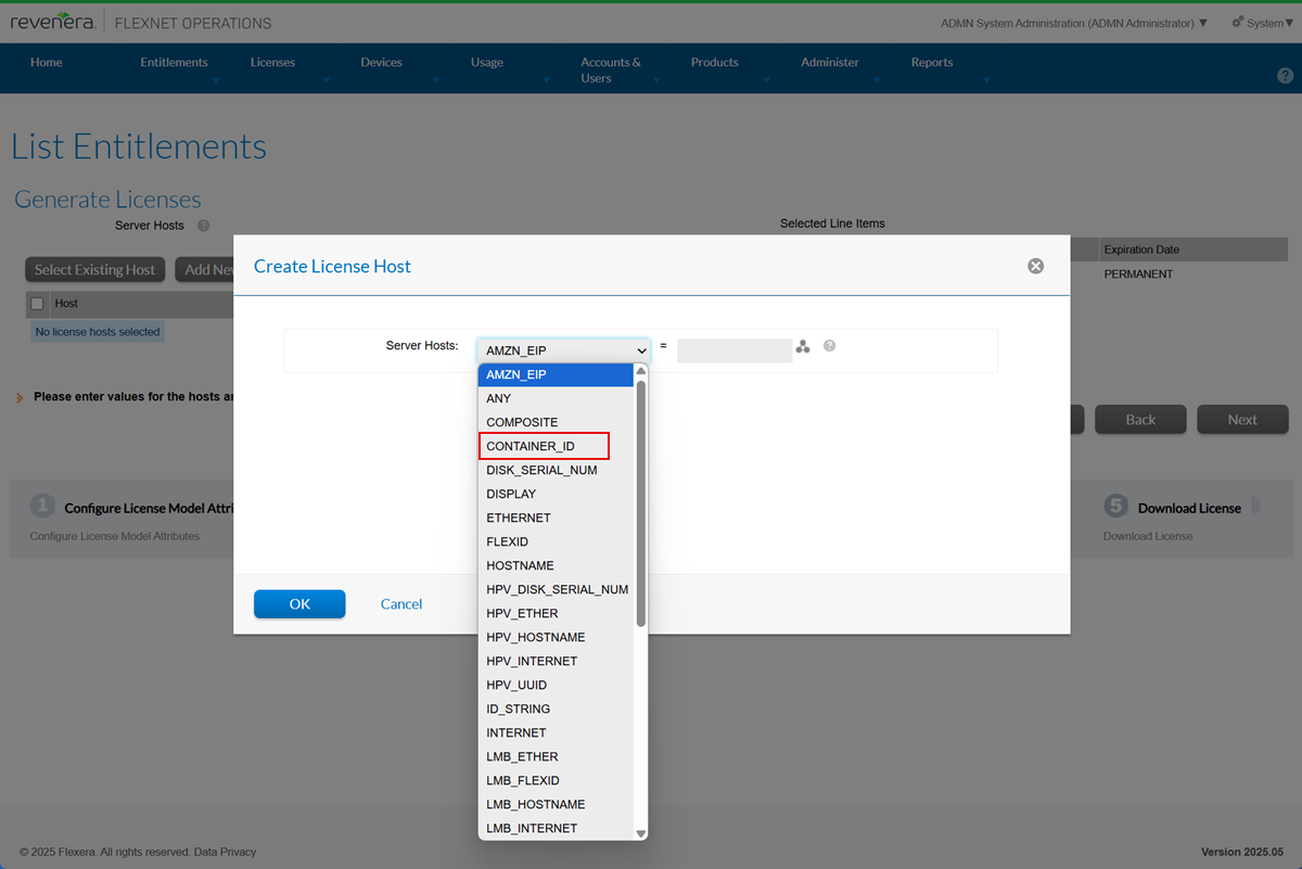 The CONTAINER_ID can be selected in the Create License Host window.