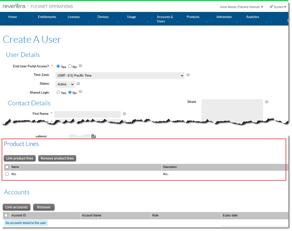 The 2025.03 therefore introduces a new configuration option Enable visibility of all product lines for system administrators (under System > Configure > FlexNet Operations > General Options). If enabled, the Product Lines section on the Create a User and Create an Account pages in the Producer Portal displays all product lines, including those created by other producer users. The Link product lines button in that section, which was previously limited to product lines created by the logged-in user, now allows linking of product lines created by other producer users.