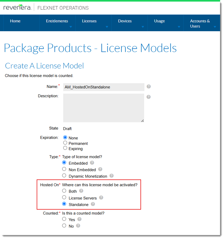 When the license model of an existing product is changed—for example, the license model is changed from HostedOnServerOnly to HostedOnStandalone—FlexNet Operations will correctly validate license applicability based on device type.