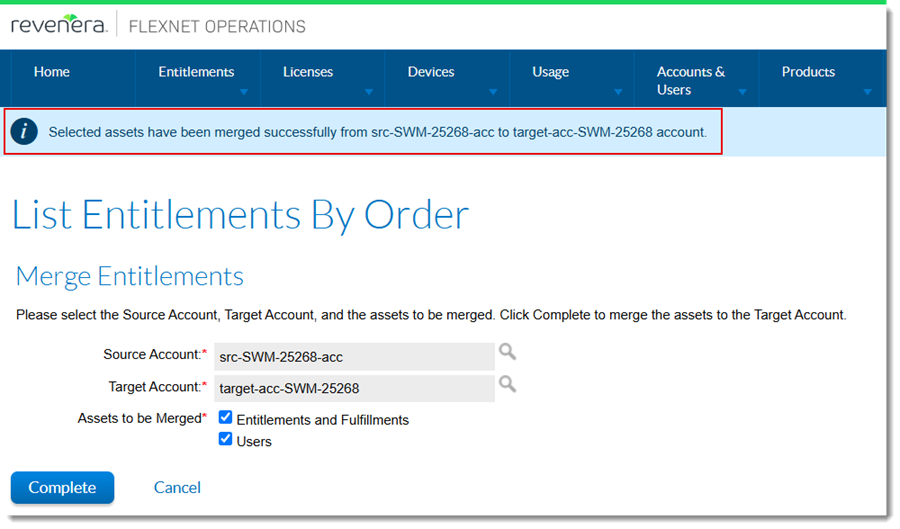 Previously, when a user initiated a merge operation by selecting the assets to be merged and clicking Complete on the List Entitlements By Order | Merge Entitlements page, the Producer Portal redirected the user to the List Entitlements By Order page which then listed the merged assets. This behavior was confusing, because the user had no immediate way of knowing whether the merge was successful.