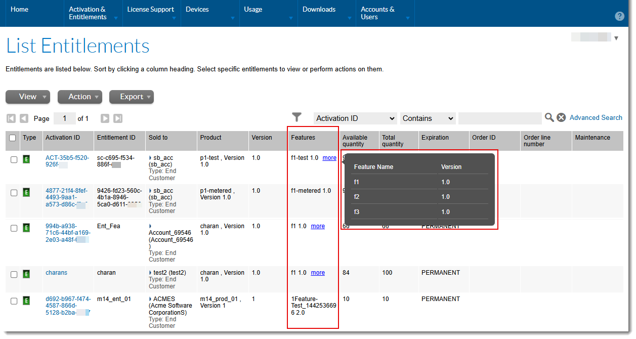 In the Producer Portal and the End-User Portal, the List Entitlements page can display an additional Features column, which would show the name and the version of the feature that is associated with a product. If a product includes more than one feature, a more... link is displayed. Pointing to the link lists all features that are linked to the product.