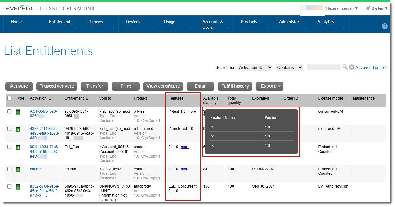 This enhancement is disabled by default. Producers who would like the Features column to be displayed should send a request to Revenera support. Revenera strongly recommends that producers ensure that displaying the Features column does not interfere with the way they currently use the List Entitlements page.