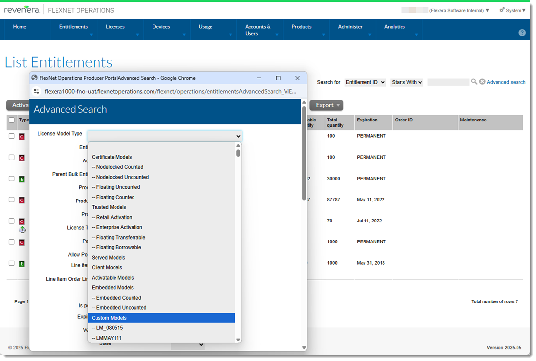 On the List Entitlements page, the Advanced Search now allows users to filter entitlements by custom license models. This enhancement is available in both the Producer Portal and the End-User Portal.