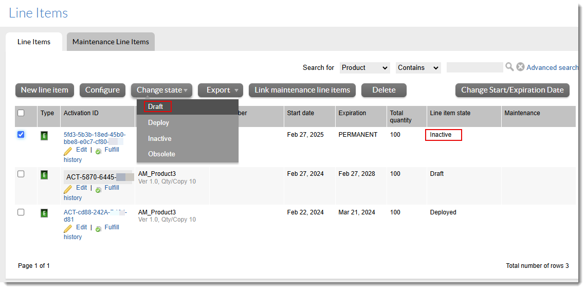 Changing the line item status from Inactive to Draft in the Line Items section of the Entitle Customers to Licenses page