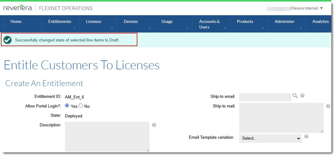 The Entitle Customers to Licenses page shows a confirmation message after changing the line item’s status.