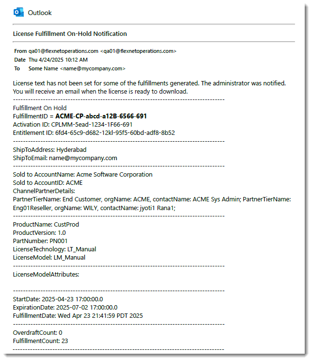 When an on-hold fulfillment is created, an email can be triggered to notify the producer that the fulfillment is waiting for a license to be set. The Fulfillment On Hold template, on which such an email would be based, has now been enhanced to include additional merge tags to include relevant details. (Previously, the only merge tag available in this template was [[FulfillmentID]].)