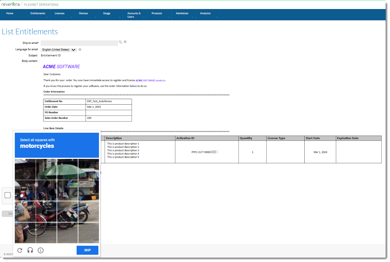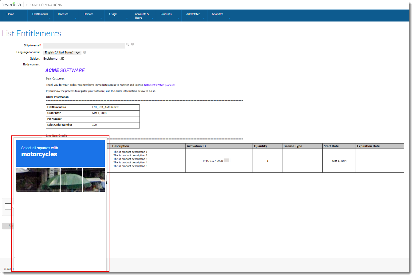 To send an email from the List Entitlements page (under Entitlements > List Entitlements), select an entitlement and click Email. On the next page, click I’m not a robot. The Google reCAPTCHA challenge displays a set of pictures and prompts you to select certain pictures to prove that you are human before sending the email.