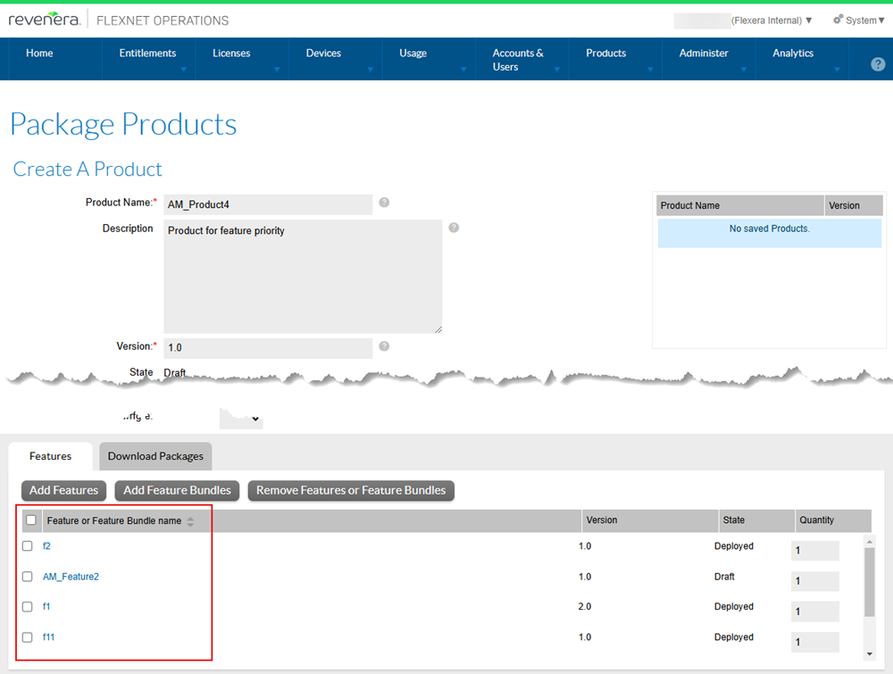 On the Products page (under Products > Product > click a product name), features and feature bundles (on the Features tab) can now be sorted based on the date they were added to the product. By default, they are arranged in ascending order (the oldest feature or feature bundle is displayed at the top of the list). The order can be reversed by clicking the header of the Feature or Feature Bundle Name column.