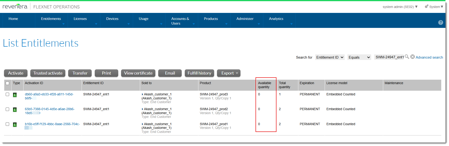 Previously, when the configuration option Show Line Items with Zero Copies by Default (under System > Configure > FlexNet Operations > General Options) is unselected, there was a discrepancy between the number of entitlements listed on the List Entitlements page in the Producer Portal and on the List Entitlements page in the End-User Portal. The reason was a synchronization issue, which meant that entitlements with an available quantity of zero were erroneously displayed on the List Entitlements page in the End-User Portal.