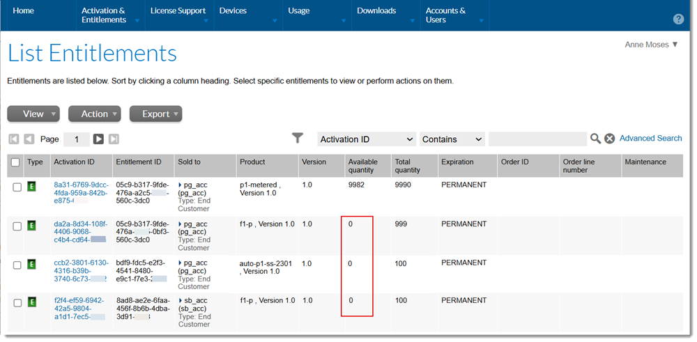 An example of the List Entitlements page in the End-User Portal showing entitlements with zero available quantity.