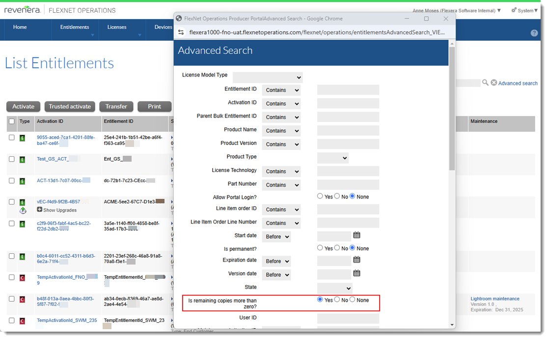 This release resolves an issue with the option Is remaining copies more than zero? that is available in the Advanced search panel on the List Entitlements page. In previous releases, regardless of whether the option was set to Yes or No, the List Entitlements page showed entitlements with copies greater than 0 as well as those with 0 copies.