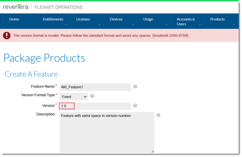 In previous releases, when a feature was created with the Version Format Type set to Fixed and the Version field included a space (for example, “1.0 “), the feature was created successfully. However, adding such features to a product later failed with the following error message: