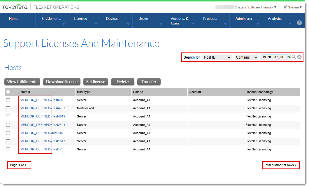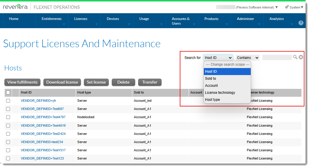 In the Producer Portal, producers can list fulfillment or license information for non-embedded licensing technology (such as FlexNet Publisher) for specific hostids on the Support Licenses and Maintenance page (under Licenses > Hosts). The following screenshot shows the Support Licenses and Maintenance page along with the search options: