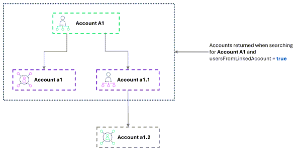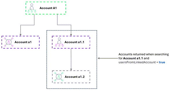 A query for account ID or account name A1 with usersFromLinkedAccount = true would return users from all three accounts—A1, a1, and a1.1—that are directly linked to A1: