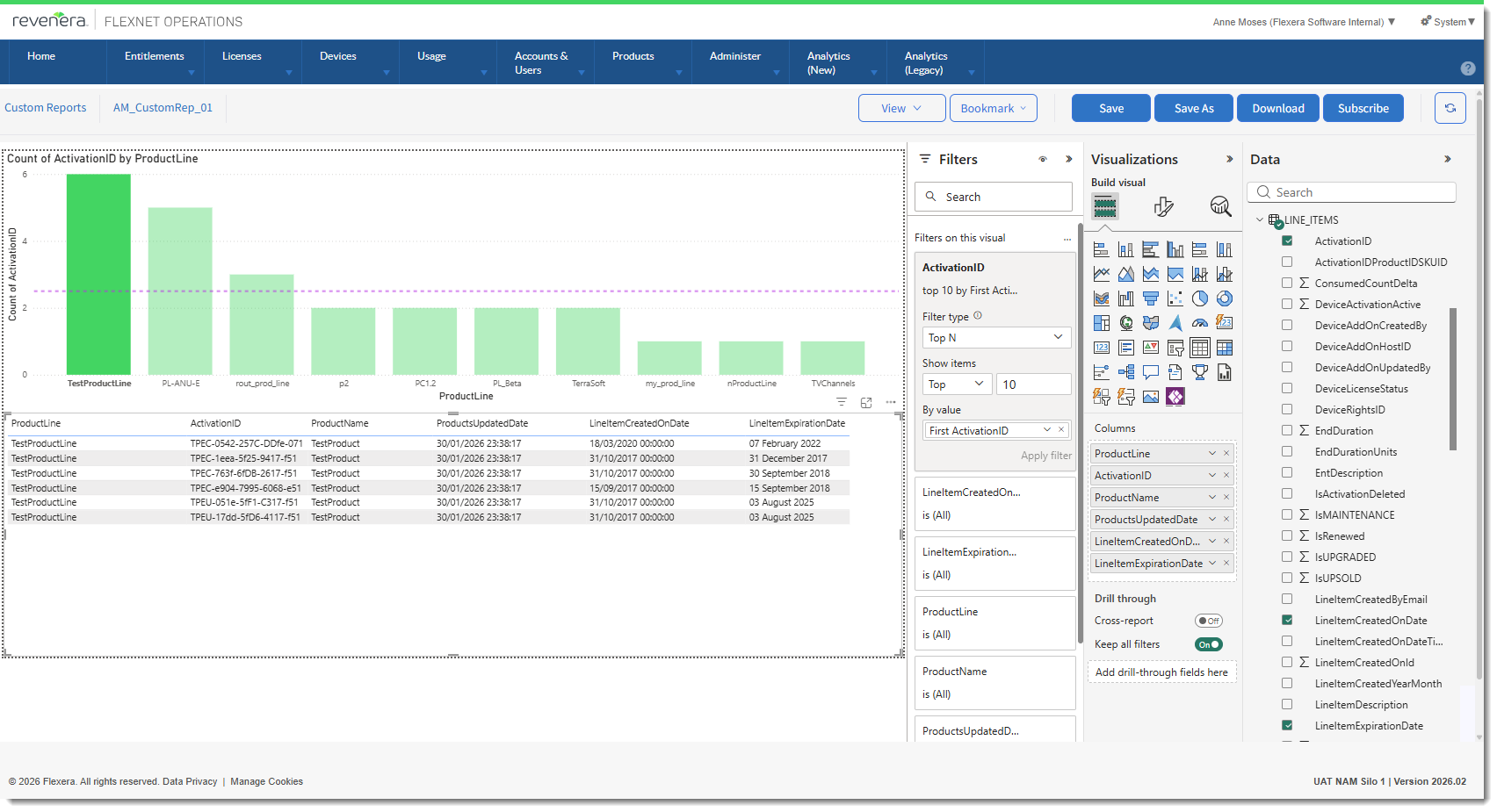 The report editor with the Filters, Visualizations, and Data panels.