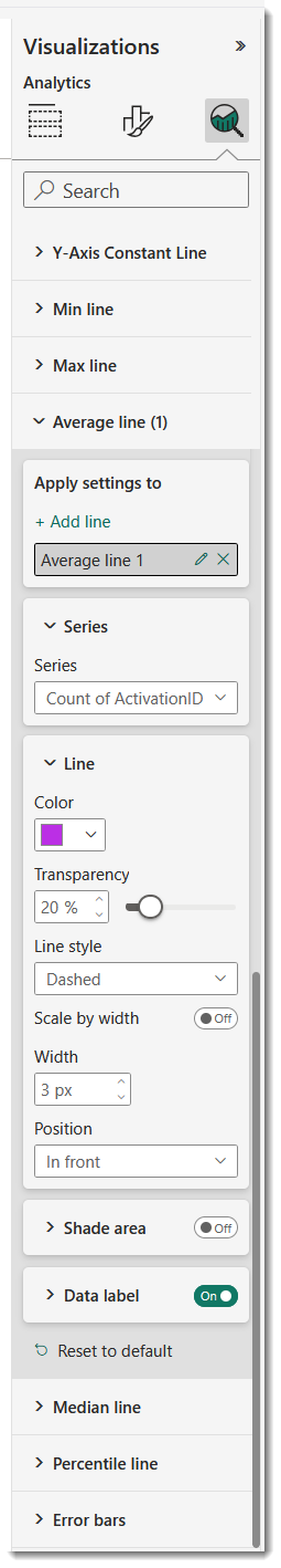 Using the Analytics functionality, you can add dynamic reference lines to visuals, helping highlight key trends and draw attention to important insights.