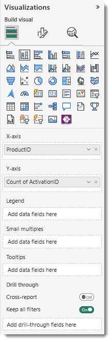 The buckets in the Visualizations pane change depending on the type of visualization you choose. For example, selecting a bar chart displays buckets such as X-axis, Y-axis, Legend, and Values. When you select a Data item or drag it onto the canvas, the Analytics functionality automatically places the Data item into an appropriate bucket. You can also drag Data items directly from the Data pane into specific buckets.