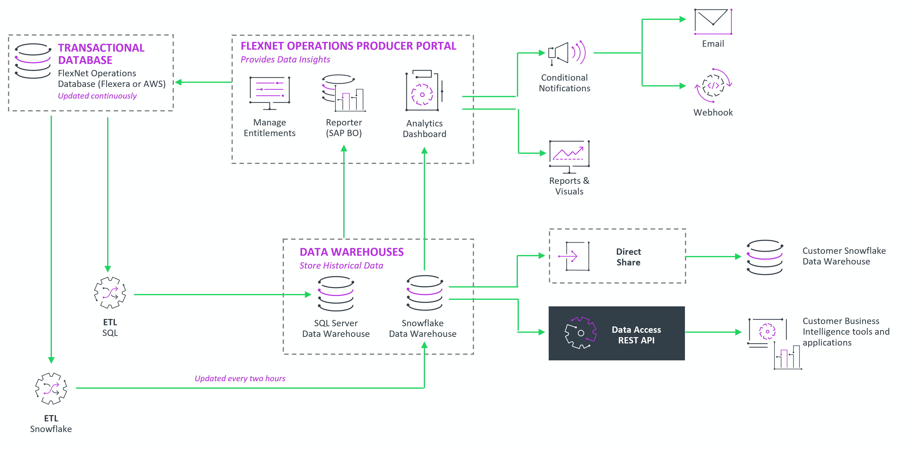 The Data Access API provides programmatic access to key operational datasets within FlexNet Operations data warehouse, enabling customers to retrieve data on demand using secure REST endpoints. Unlike Data Share which delivers data directly through Snowflake, the Data Access API is designed for customers who prefer application-level access, custom integration workflows, or environments that do not leverage Snowflake. Using the APIs, the data can be integrated into any web or mobile application.