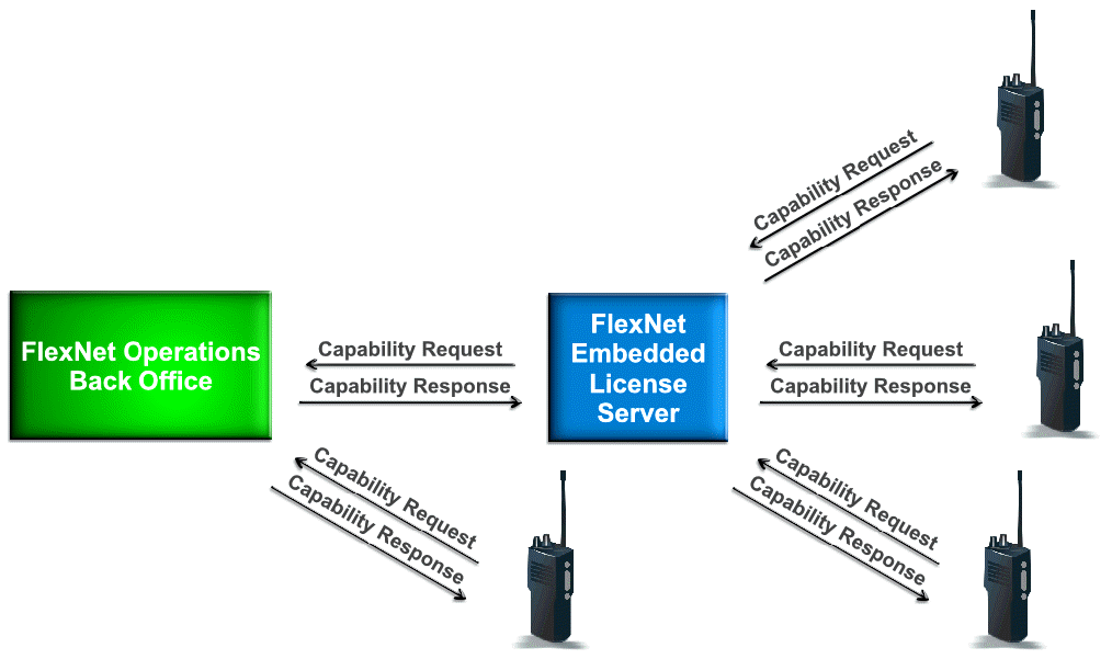 The FlexNet Embedded license server communicates with FlexNet Operations to manage devices and product features for a collection of served devices. If a FlexNet Embedded license server is used, served devices connect to this server rather than connecting directly to FlexNet Operations.