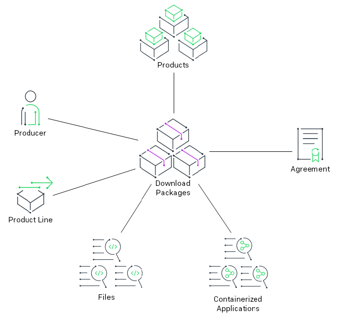 A product can have many download packages, and download packages can be associated with one or more products. Download packages collect files