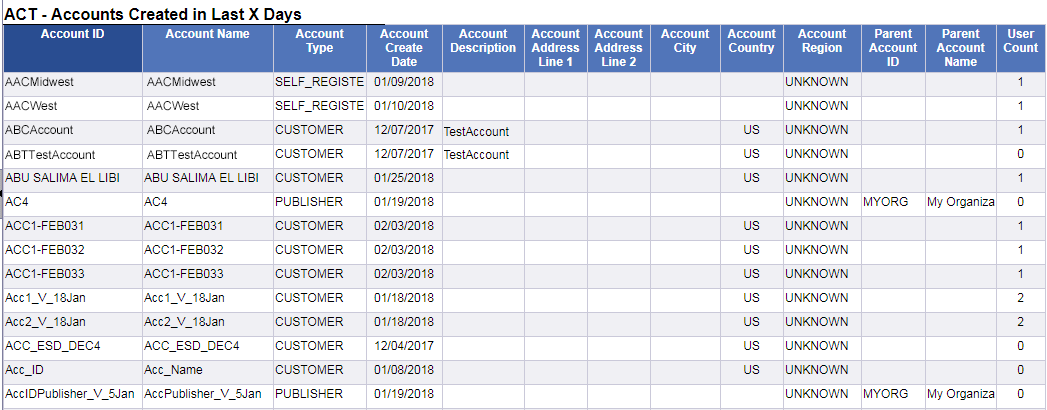 The Accounts Created in Last X Days report shows recently created accounts with information about their account type, creation date, description, address, and number of users.