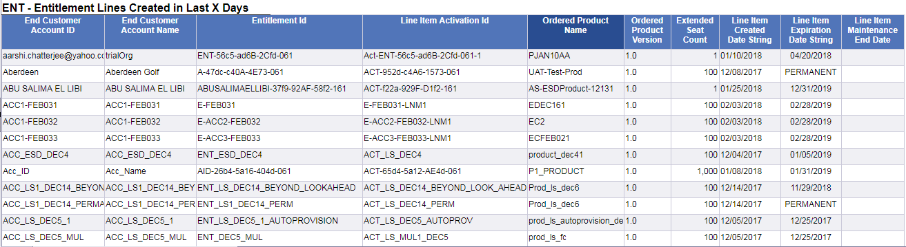 The Entitlement Lines Created in Last X Days report shows recently created entitlement lines with information about their owner, entitlement ID, activation ID, product name and version, as well as the entitlement lines’ creation, expiration, and maintenance end dates.