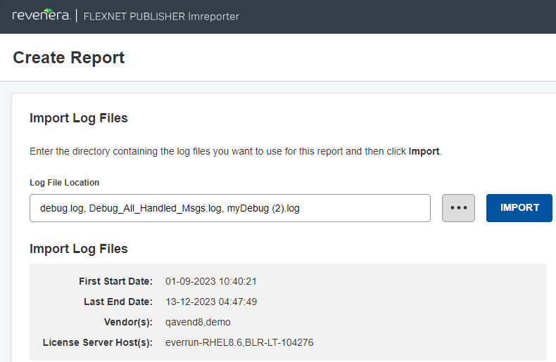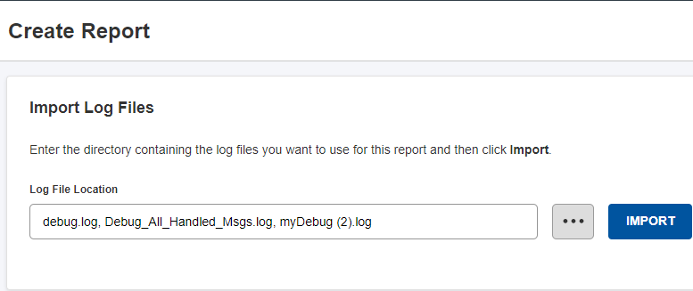 | • | Upload debug log files—To initiate graph generation, you need to specify the location of the debug logs folder. In the Import Log Files area of the Create Report page, specify or browse to the the Log File Location, and then click Import. |