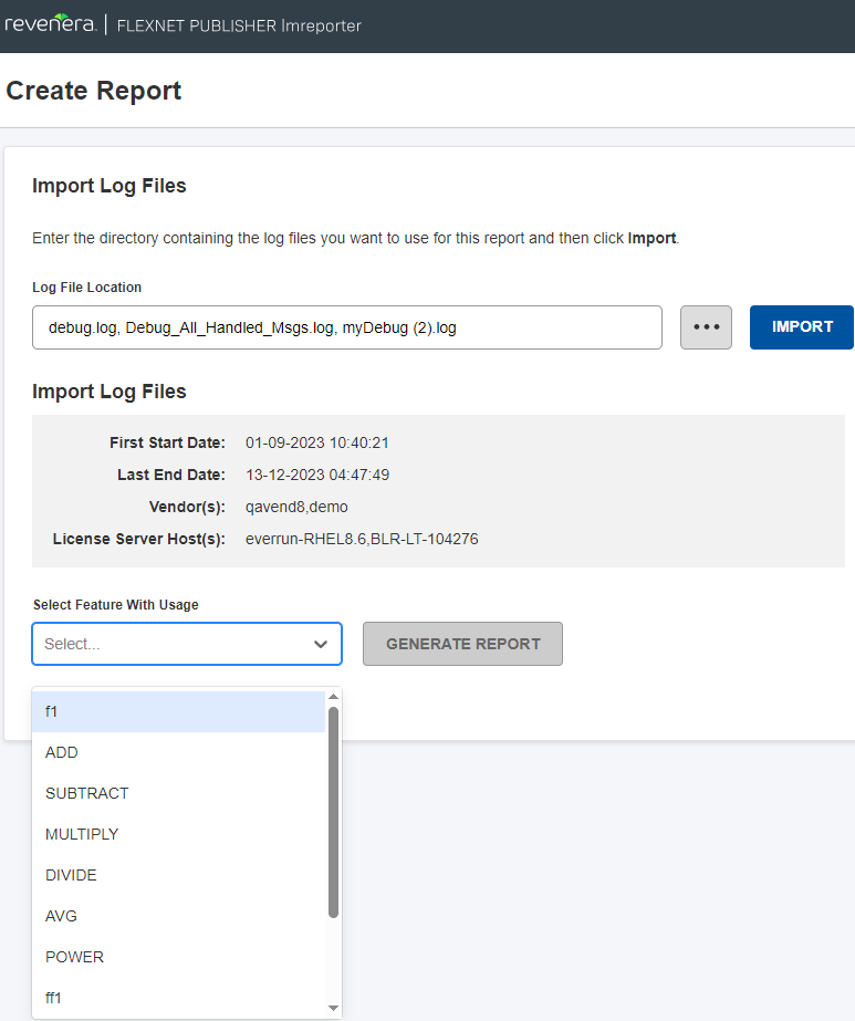| • | Generate Reports—After importing the debug log files, select a specific feature and (if more than one is specified) a vendor daemon from the drop-down menus. The following displays selecting a specific feature from the Select Feature With Usage drop-down: |