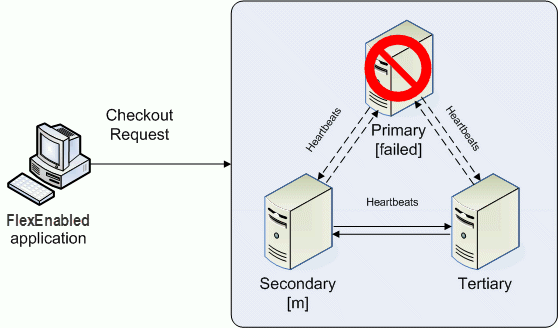 If the master fails, then the secondary license server becomes the master (see the following figure) and will serve licenses to FlexEnabled applications. The tertiary license server can never be the master. If both the primary and secondary license servers go down, licenses are no longer served to FlexEnabled applications. The master will not serve licenses unless there are at least two license servers in the triad running and communicating.